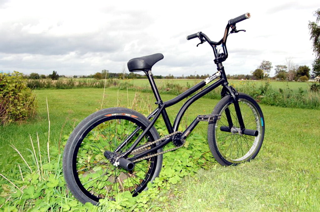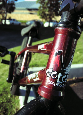 Alex rides our 2009 Bloody Oath frame in the special ‘kids’ size. It features a 19.8″ TT with a 13.5″ rear end & weighs in at 4.2lbs. It’s aimed at the younger riders out there that want a high quality, light weight frame that also has the geometry to suit them.