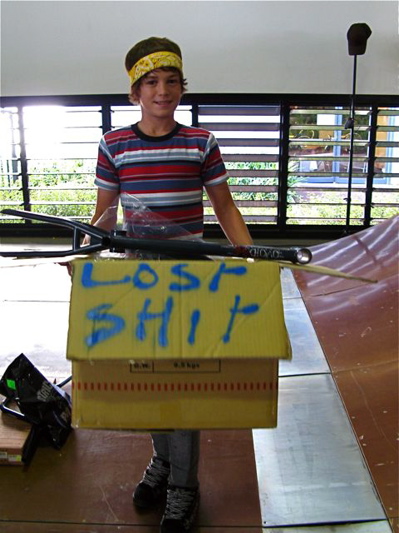 Alex with his bunch of prizes in the lost property box.
