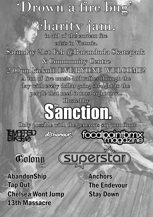 Nick Cooper is arranging a bush fire benefit jam at Beenleigh on February 28th. Check the flyer for details. Proudly supported by the companies listed. There will even be bands playing live music. You can also bid for certain people to do tricks on the day. All proceeds go to the appeal. Don’t bother showing up unless you have donations at the ready !!