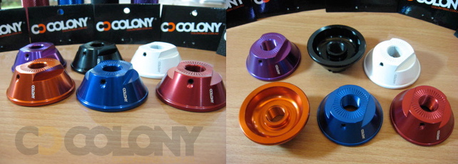 Below are some pics of the production Clone Hub Guards ready to ship soon. The colours shown here are what we will have for all our 2010 alloy parts. Black, White, Red, Purple, Blue & Tangerine. Hope you like them !! These hub guards, along with all our 2010 parts ranges, will be available from September this year.