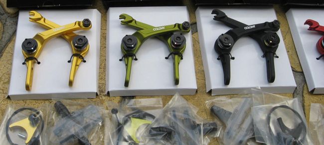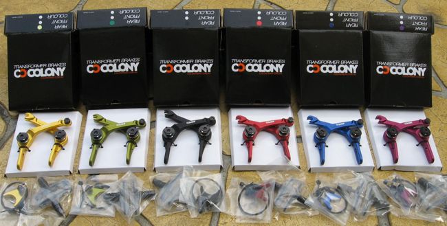 Our first ever brake set will be available in September in most corners of the globe & here you can see the first photos of them. CNC’ed from forged 6061T6 alloy for stiffness they come in an array of colours (L to R Gold, Wasabi, Black, Red, Blue & Purple) & come stock with clear brake shoes. For those that don’t use their shoes to slow down these could be your next set of brakes.