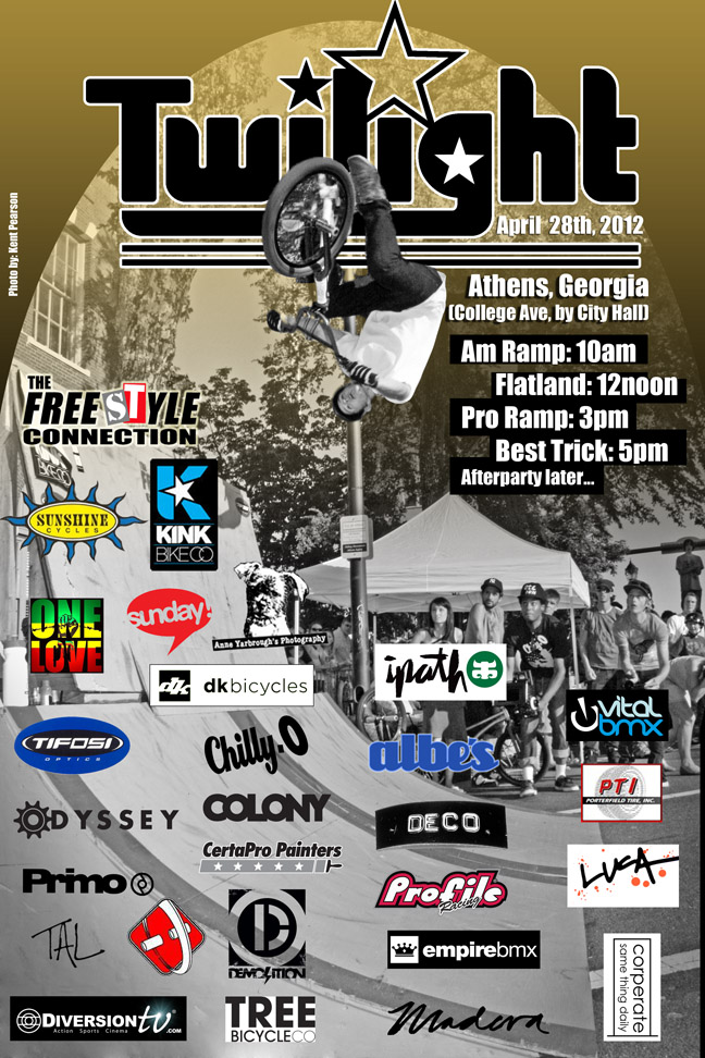 One of my best days of riding ever was a few years ago over in Athens, GA. We rode the university there for a full day & could not get enough of the place. It was for me, the best day of street riding I had ever had and still stands as such today almost 5 years later. Check out the video below of that memorable day back in 2007 but first, we are supporting an event that happens there yearly. The Twilight BMX comp is going down on April 28th & should be a great day for all. If you’re in the area, get yourself along for the day.